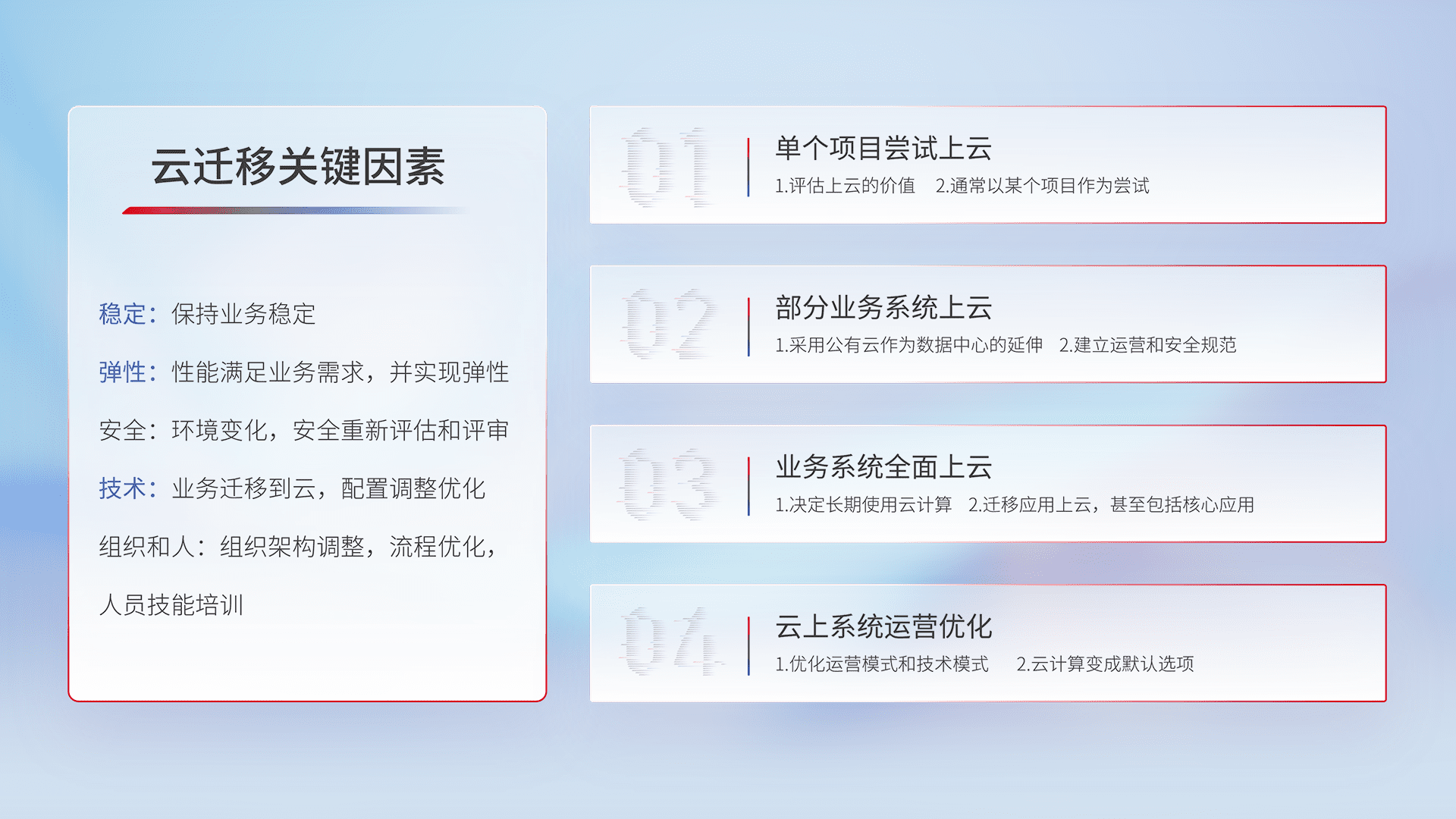 结合实际业务,,,从规划设计、、、云平台选型、、、云原生改造、、、、数据迁移、、集成交付,,,,迁移全过程为客户识别最佳上云路径,,,,做好风险识别管理,,,,设计网络架构、、、、身份权限、、、安全审计合规、、、操作审计、、、、日志审计、、、、监控告警策略、、、多站点容灾设计等,,对云上基础设施进行整体规划,,,提升IT治理水平,,,以满足弹性、、、高可用、、、、高性能的需求。。。。