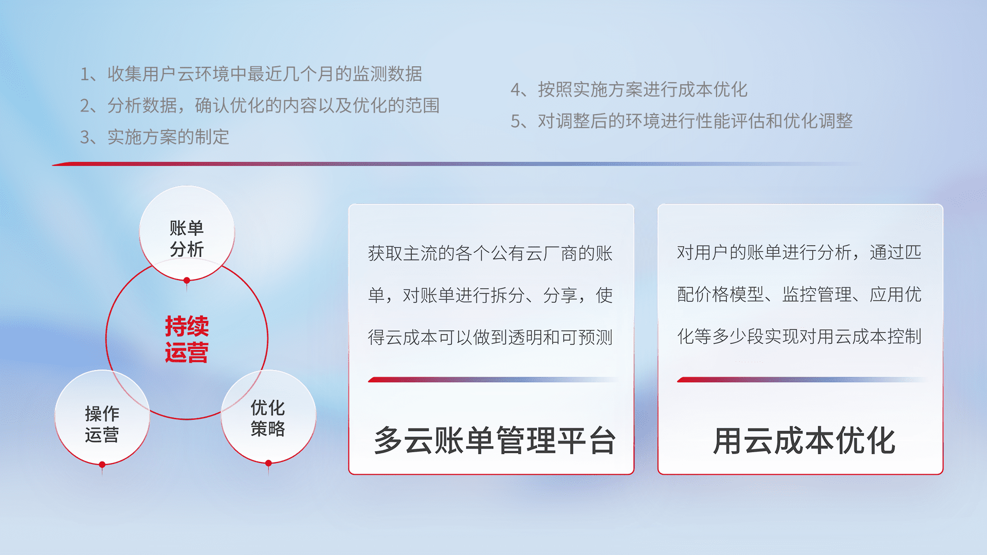 通过多云纳管,,以统一的资源数据模型把客户的云资源进行抽象和封装,,进而实现对多云资源的统一操作,,保障云资源管理的可靠性、、、稳定性与可用性。。。量身定制化运维内容,,配置、、、、开发运维、、补丁管理、、、备份、、、监控、、认证和访问管理、、审计和日常巡检等,,,保障在用云过程中的可靠度,,,稳定度以及高可用率。。。